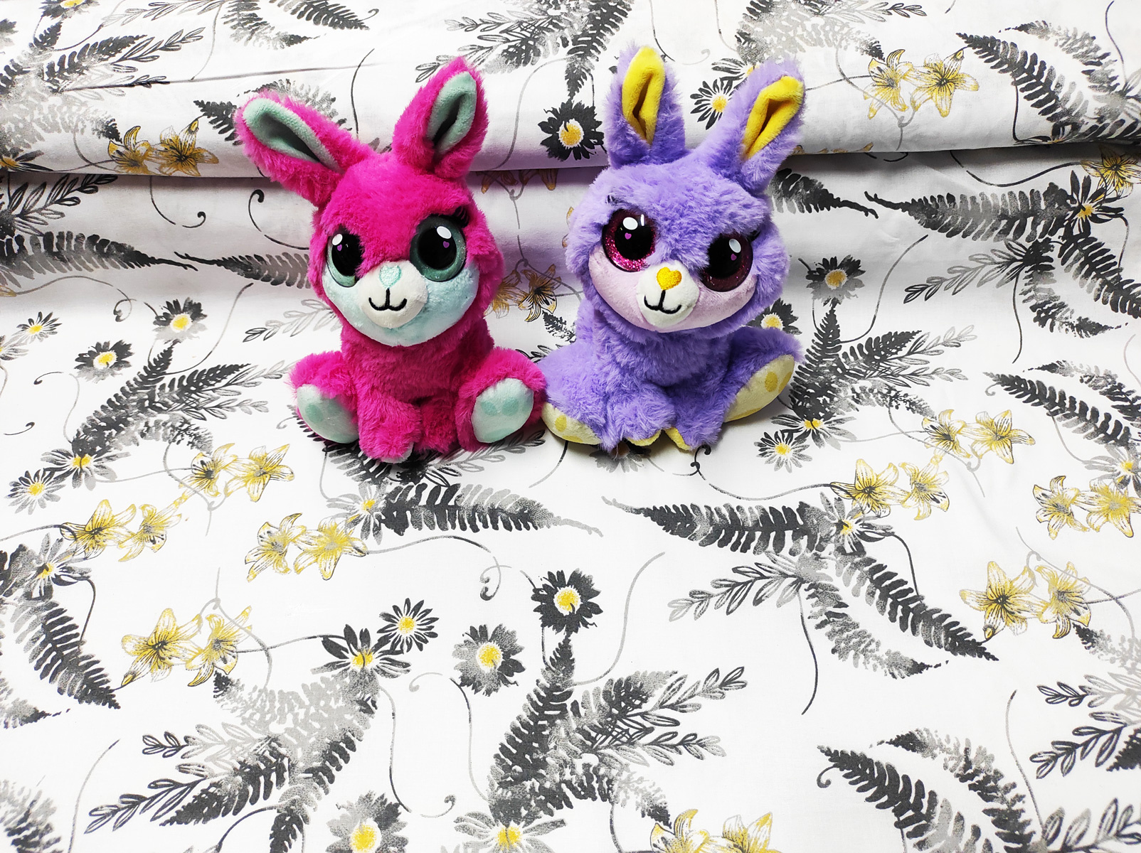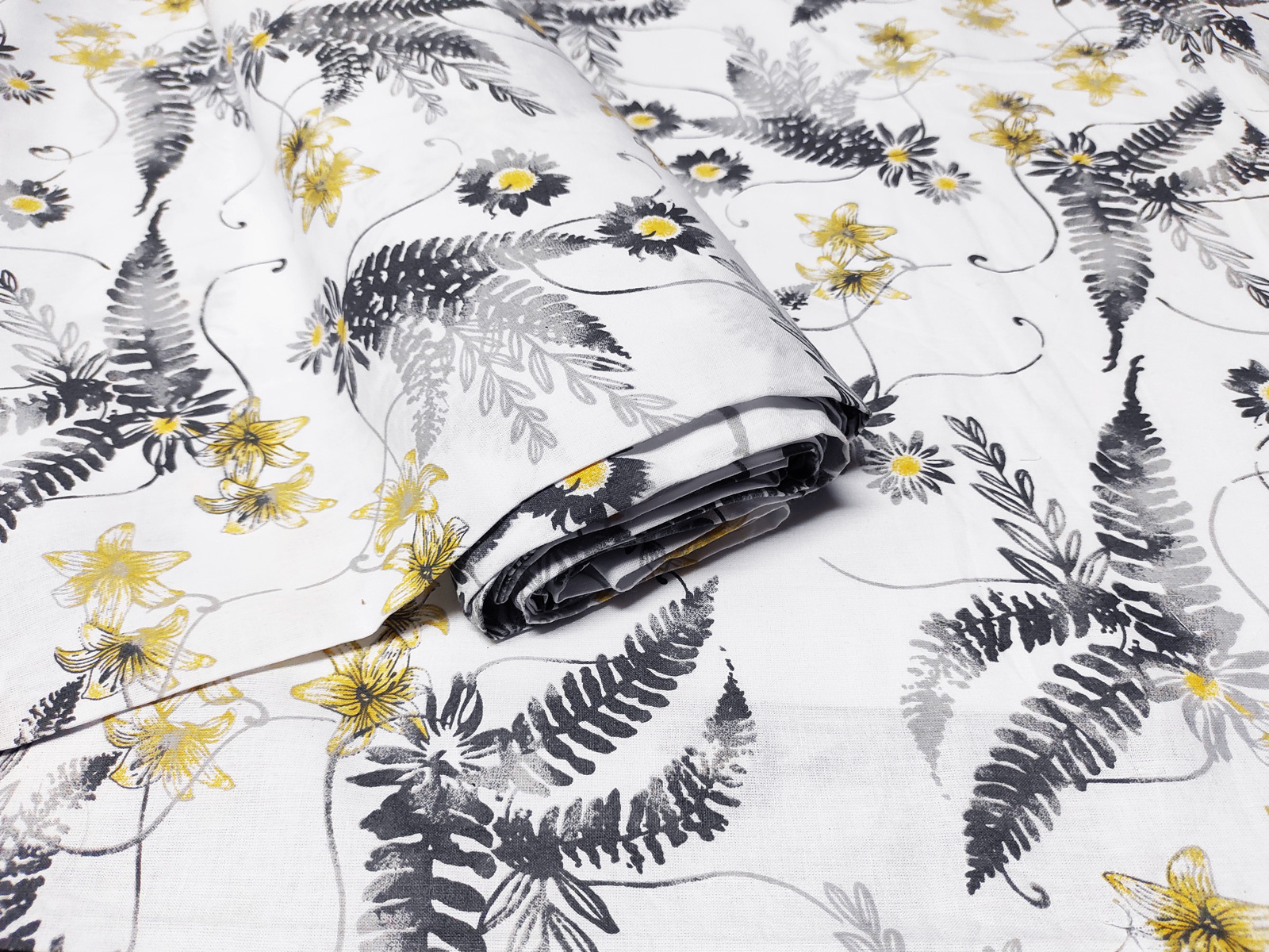 Description Cotton fabric 100% cotton, 125 g/m², width 160 cm, gray and yellow flowers on white