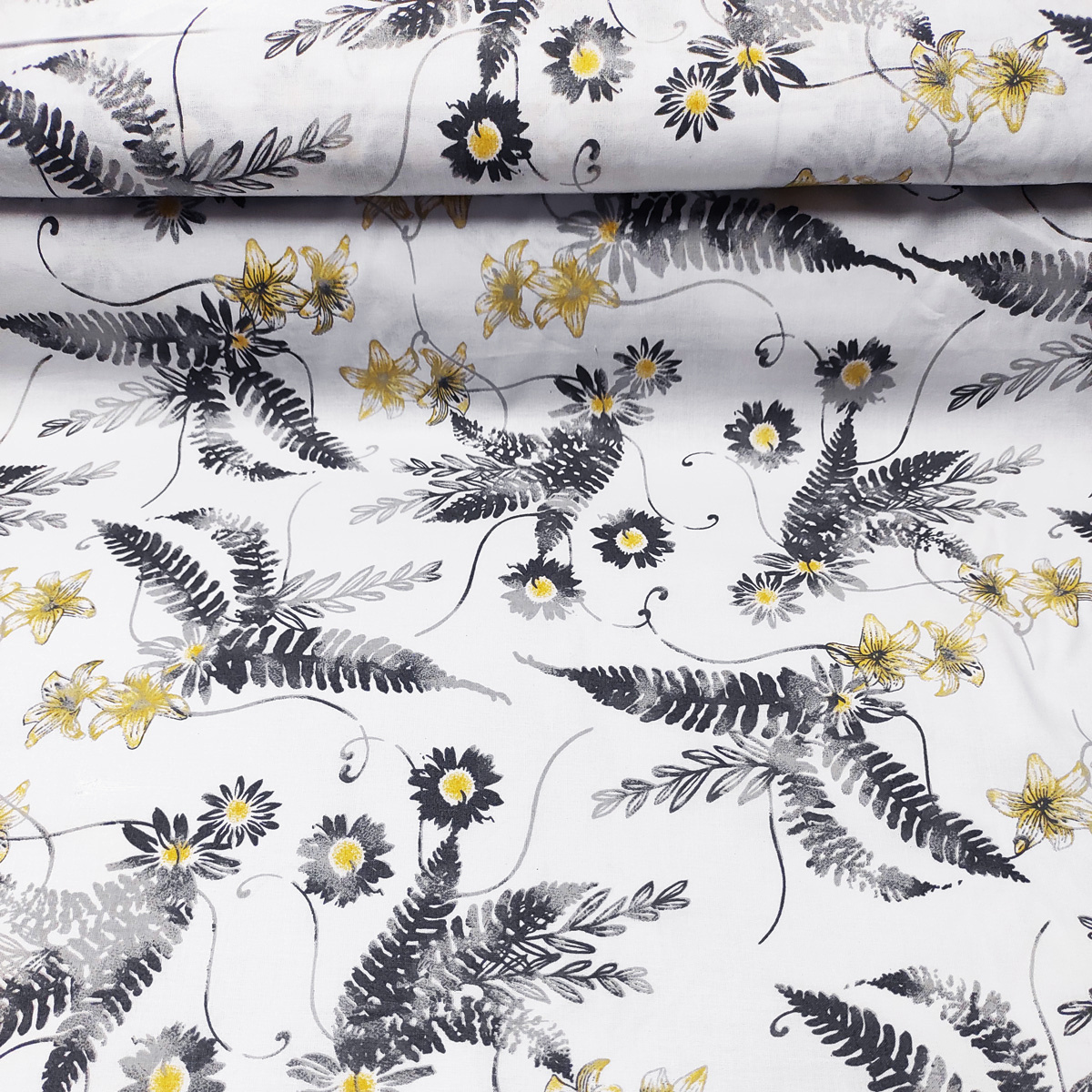 Cotton fabric 100% cotton, 125 g/m², width 160 cm, gray and yellow flowers on white