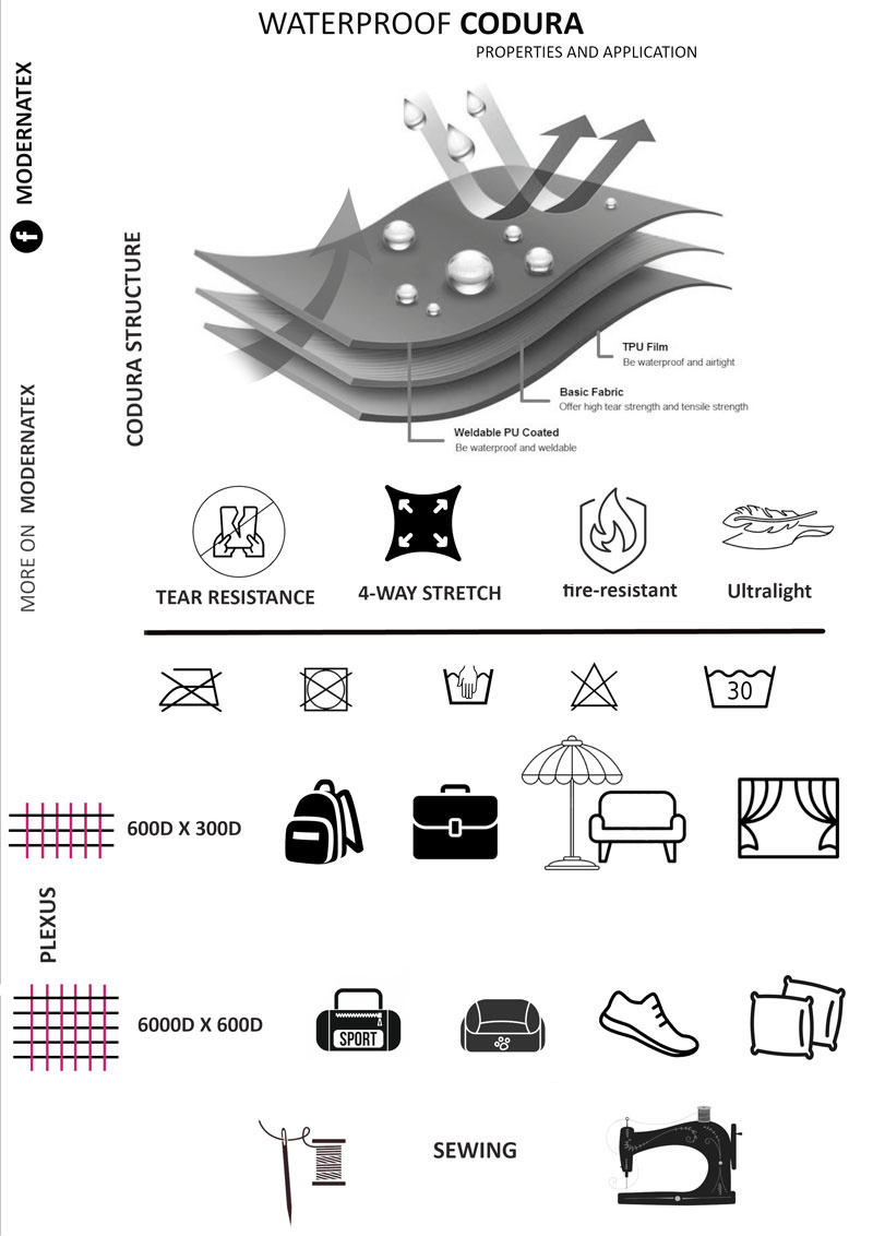 Codura a základní vlastnosti tkaniny: Výroba látky Codura zahrnuje několik fází, což ve výsledku umožňuje dodávat na trh kvalitní plátno s dlouhodobě odolným povrchem. Někdy se k nylonovému vláknu přidává malé množství bavlny, jenž je patrné na vzhledu (povrch je díky vlasům chlupatý) a poznáme to ve vlastnostech. Například, že látka je odolnější proti opotřebení.