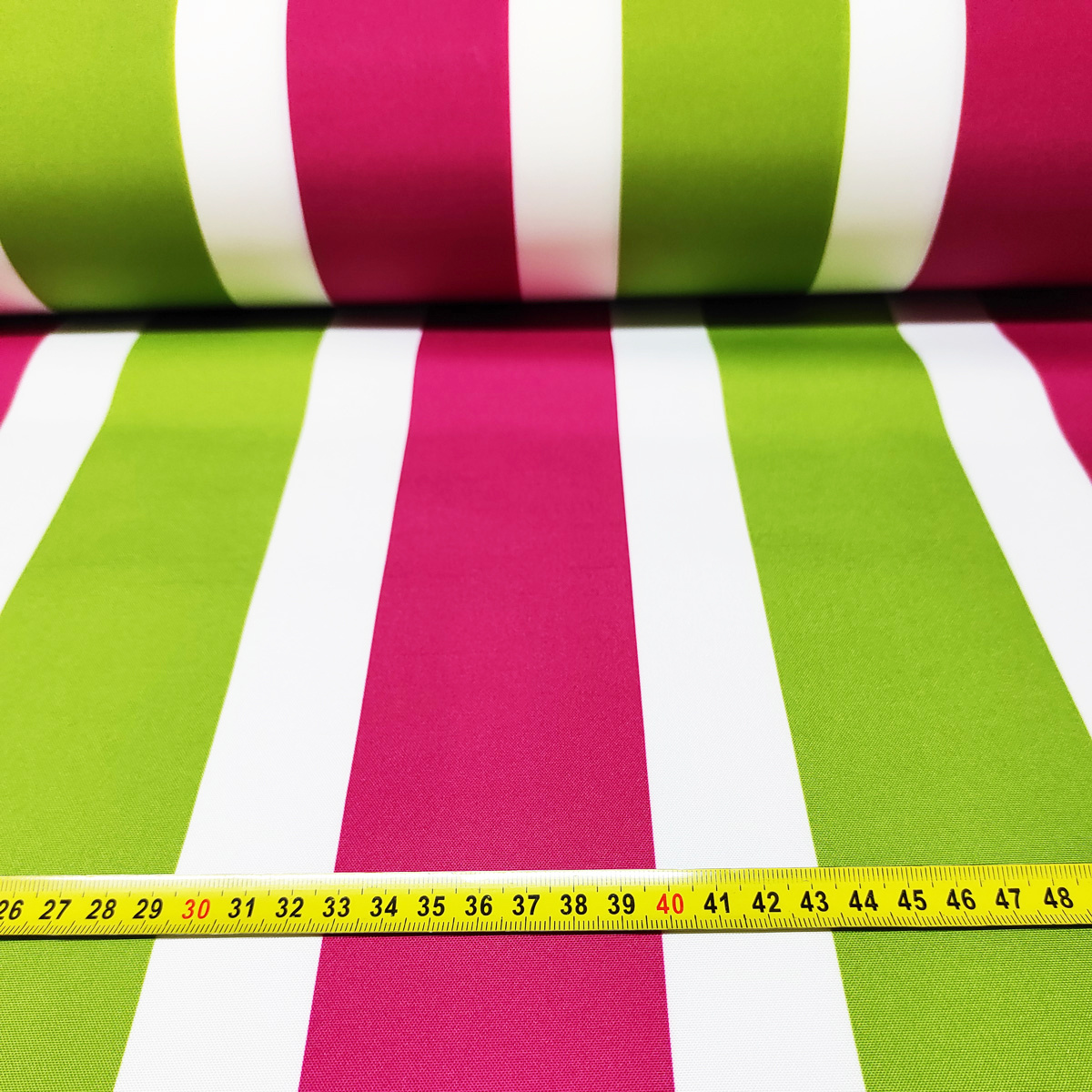 - husté pletení odolné vůči mechanickým vlivům - vnitřní krycí vrstva polyuretanem a teflonem na druhé straně tkaniny (bezbarevní nátěr) - měkká krycí vrstva téměř nepostřehnutelná - složení látky: 100% polyester - šířka 160 cm +/- 2 cm - gramáž 190 gr/m2 - nepromokavá látka - norma PN-EN 71-3: 2013-07E (bezpečnost hraček) - odolnost barviv proti ultrafialového záření (vyblednutí na slunci) - látka může být šitá pomocí domácího stroje   Látka je odříznuta z role 160 cm široké, zakoupením jednoho kusu, dostanete kus 100x160 cm. Pokud si koupíte několik kusů látky, dopravíme je v jednom kuse. Směr pruhovaného vzoru: po celé délce tkaniny
